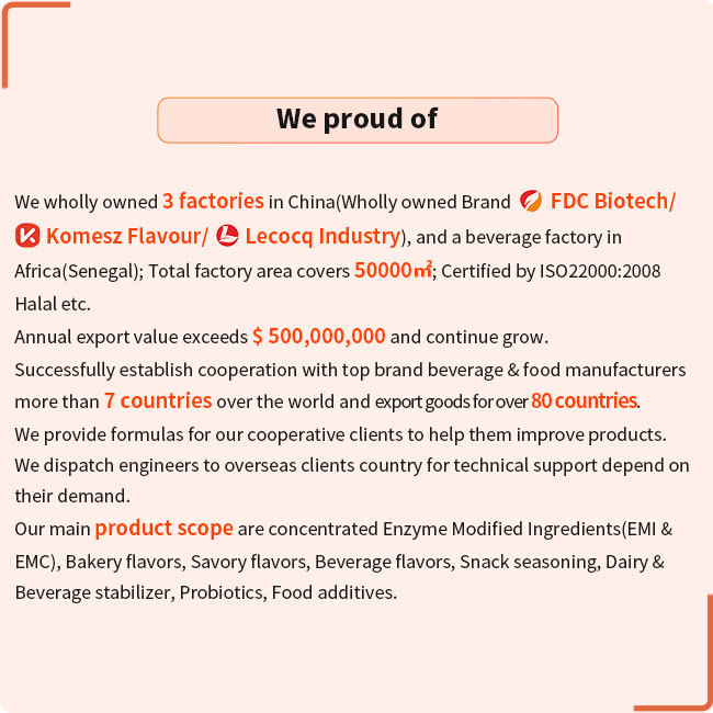 हम फ्लेवर, डेयरी और जूस के लिए स्टेबलाइजर्स, प्रोबायोटिक्स, केंद्रित सिरप और पोषण संबंधी सुधार सहित 4000 से अधिक खाद्य उत्पाद प्रदान करते हैं।